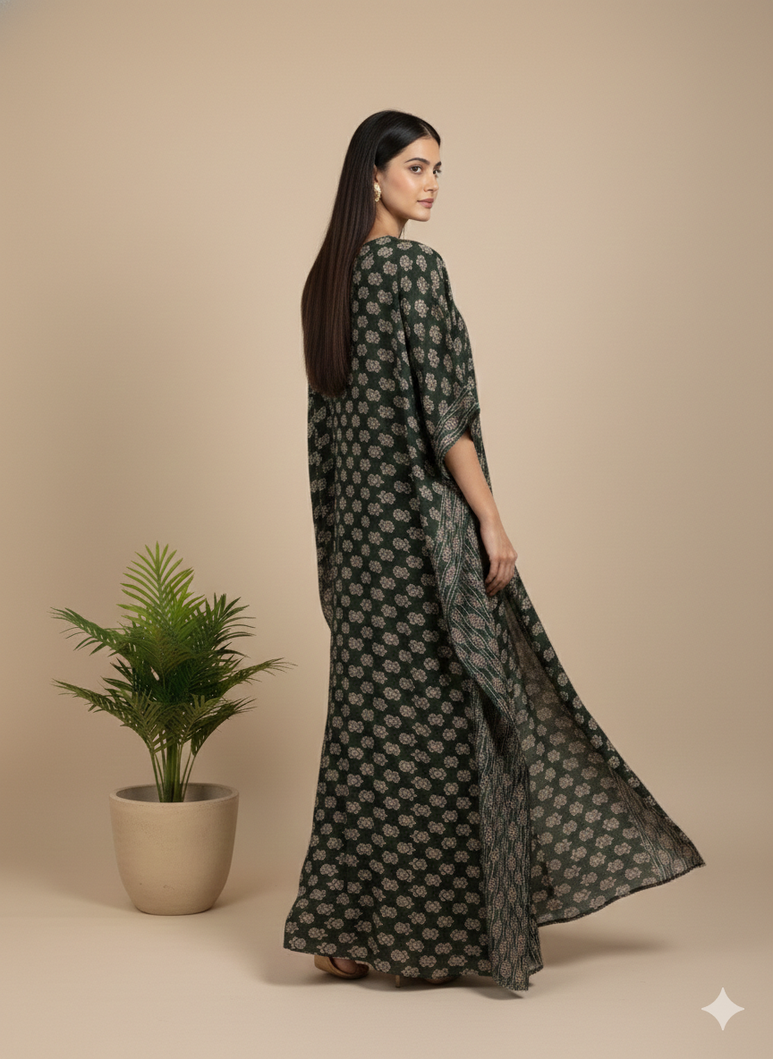 Crafted from 100% premium, lightweight cotton, this kaftan is designed for ultimate breathability and comfort. Its flowy, oversized silhouette makes it a versatile wardrobe essential—wear it as a luxury beach cover-up in the Maldives, a chic resort dress for a brunch in Miami, or a bohemian lounger for a relaxed weekend in London. With its flattering V-neckline and artisanal print, it’s the perfect blend of traditional craftsmanship and modern global fashion.